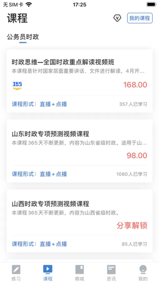 目前上线了“时政思维-全国时政重点解读”、“山东时政专项预测”、“山西时政专项预测”等课程。