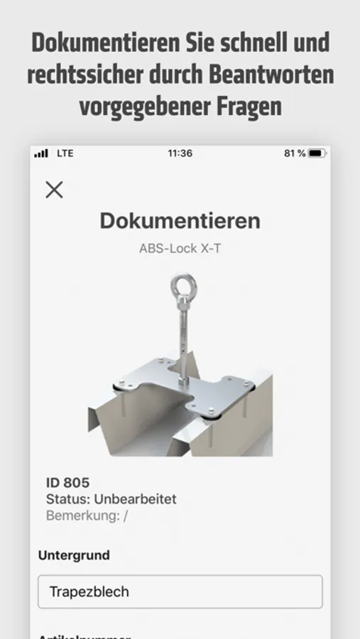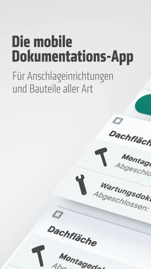 Lock Book Docu ist Dein Dokumentations-Tool fürs Dach. Die App bietet Dir eine unkomplizierte und papierlose Dokumentation bei der Montage und Wartung von Absturzsicherungssystemen. Dank des intelligenten Fragenkatalogs erstellst Du im Handumdrehen lückenlose und rechtssichere Unterlagen. Ganz neu: Mit dem Safety Check siehst Du auf einen Blick, wann und ob vorschriftsmäßig dokumentiert wurde.