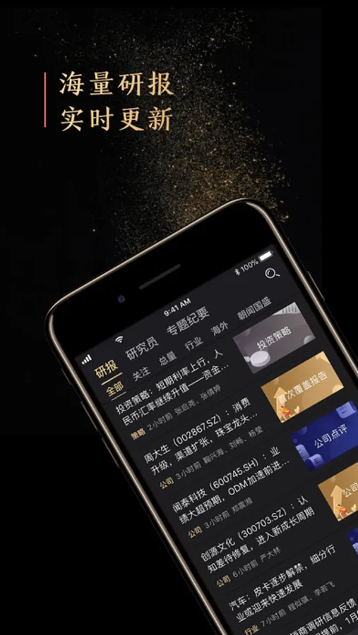 海量研究:包含宏观、策略、行业、公司等多个领域报告,不定期发布会议纪要和各类热门专题研究成果。王牌团队助阵,关注某位分析师后,可查看与他相关的研报和活动。