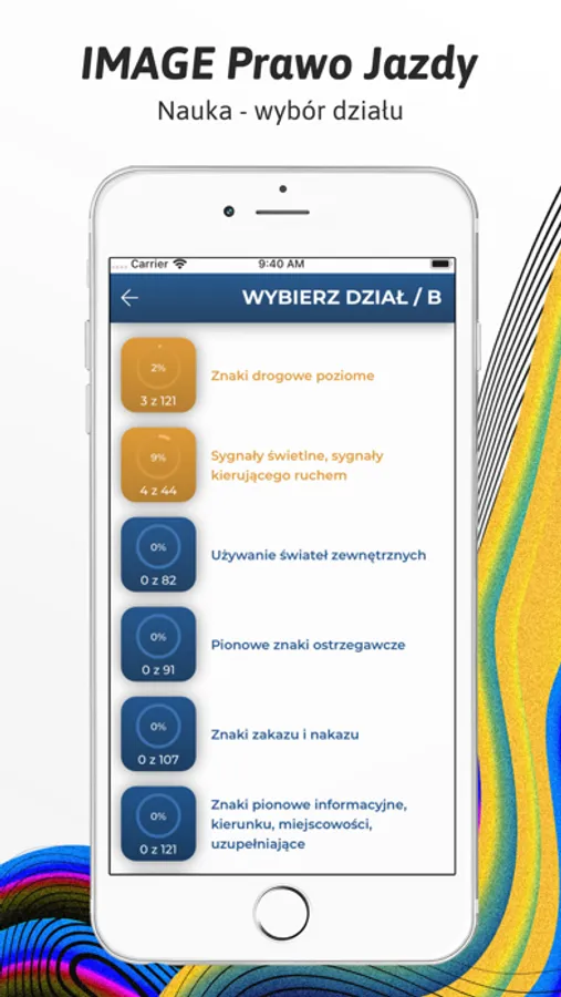 Nauka - dostęp do kompletnej bazy pytań na prawo jazdy podzielonych na działy