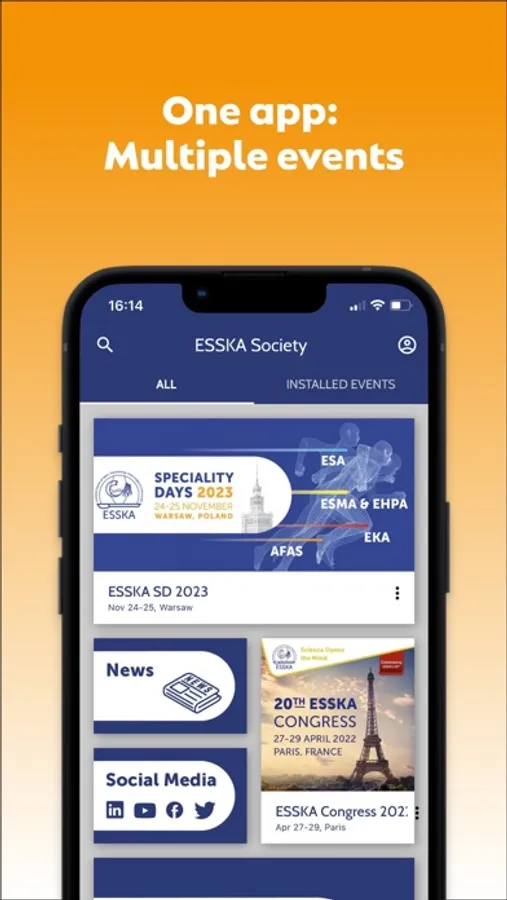 The official mobile app for the European Society of Sports Traumatology, Knee Surgery & Arthroscopy (ESSKA). An easy and interactive way to access and subscribe to ESSKA's offerings - ESSKA Congress; ESSKA Speciality Days; latest news of the ESSKA Society and its Sections - AFAS, EKA, ESA & ESMA; membership; education; ESSKA Academy; Publications: Journals - KSSTA, JEO, ESSKA Newsletter; ESSKA Books & many other ESSKA projects and initiatives.