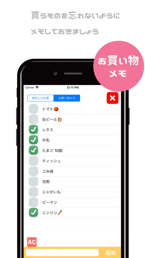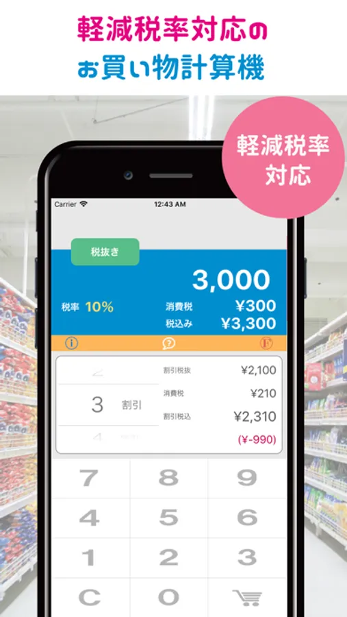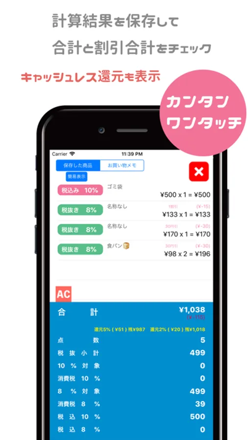 割引計算・消費税計算・合計・端数処理・お買い物メモ機能がついています