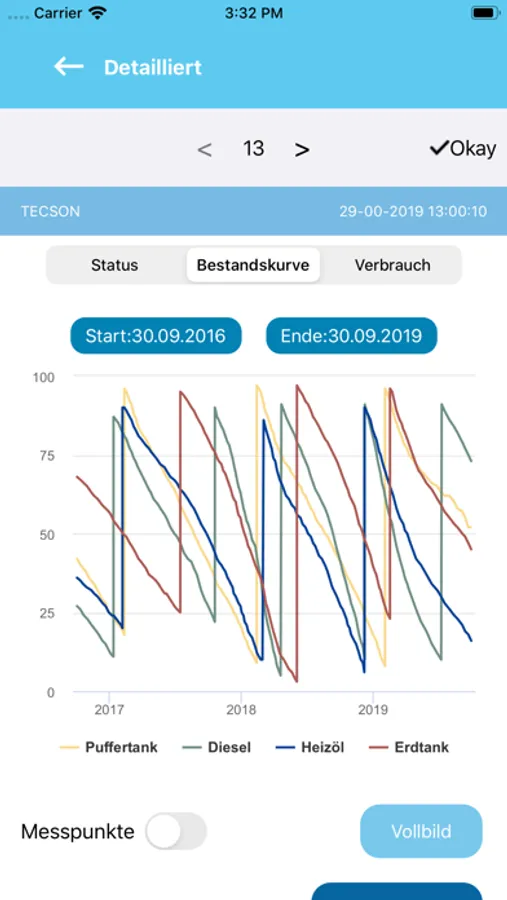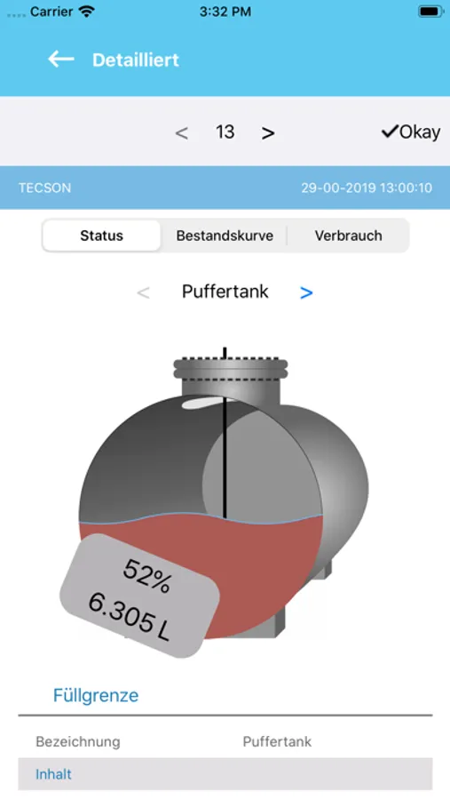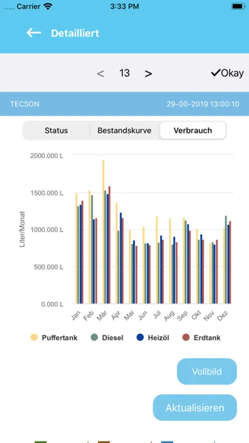 Aktueller Füllstand (% + Liter),“Reserve“-Alarm, Verbrauchsauswertung 3 Jahre, etc.