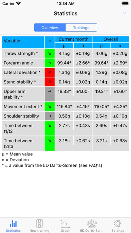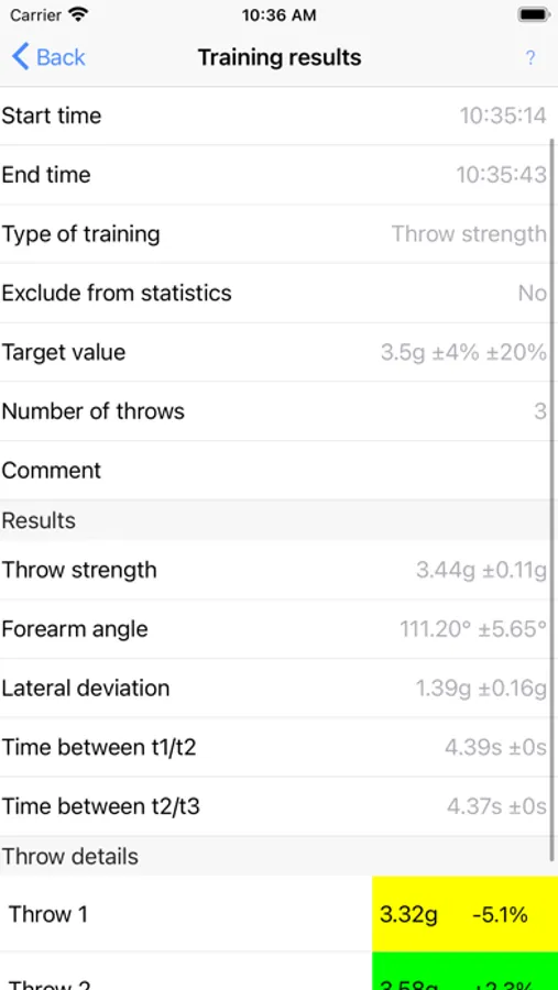 All training results are shown in an overview table. The average values and standard deviation are displayed for each training type. In addition, the average times between the first and second throw and between the second and third throw are calculated.