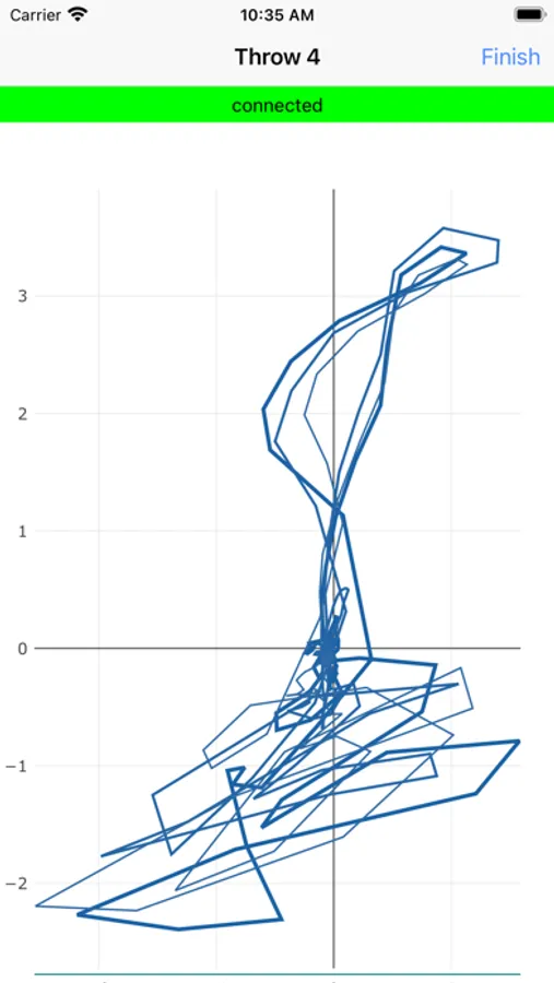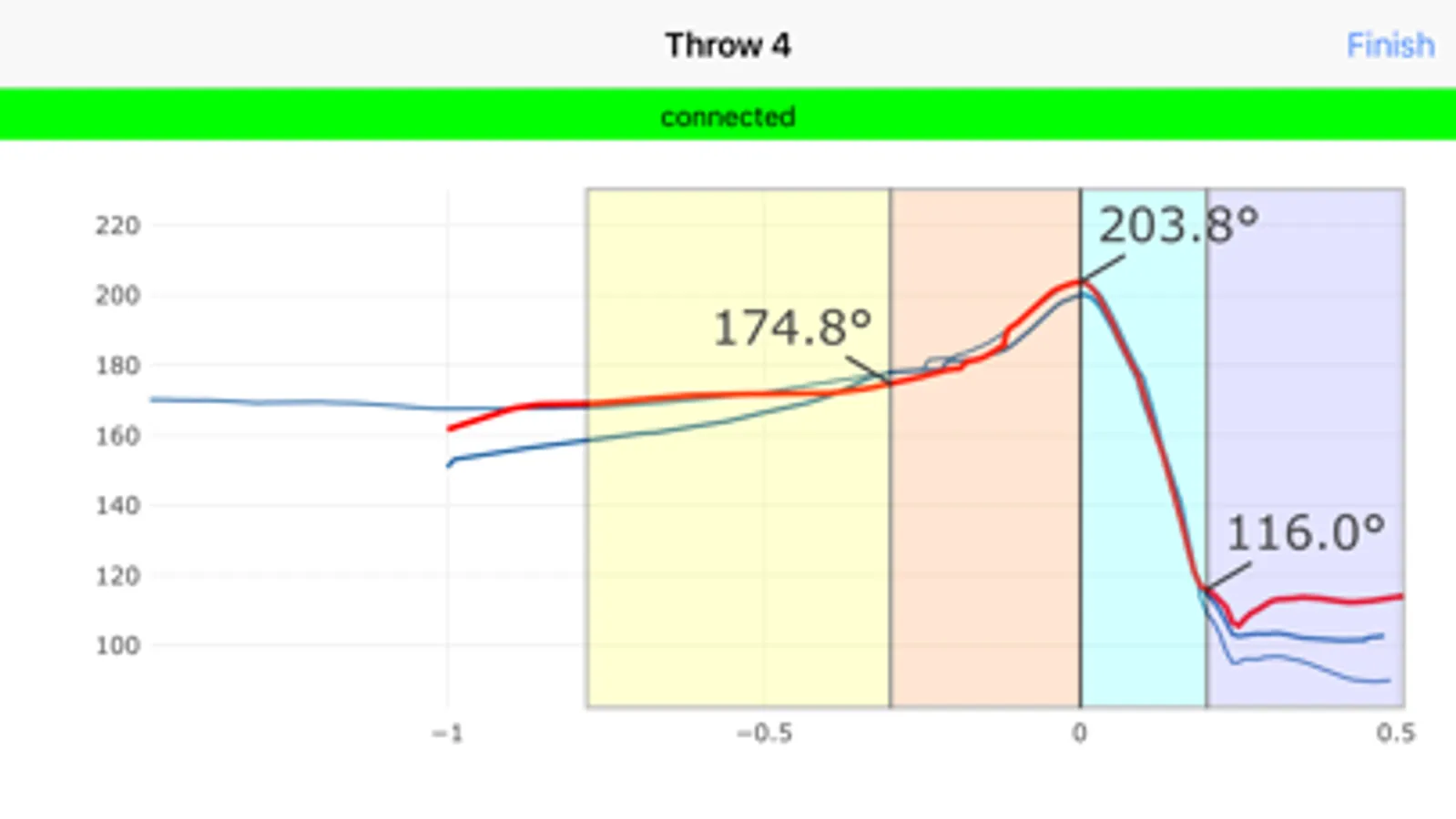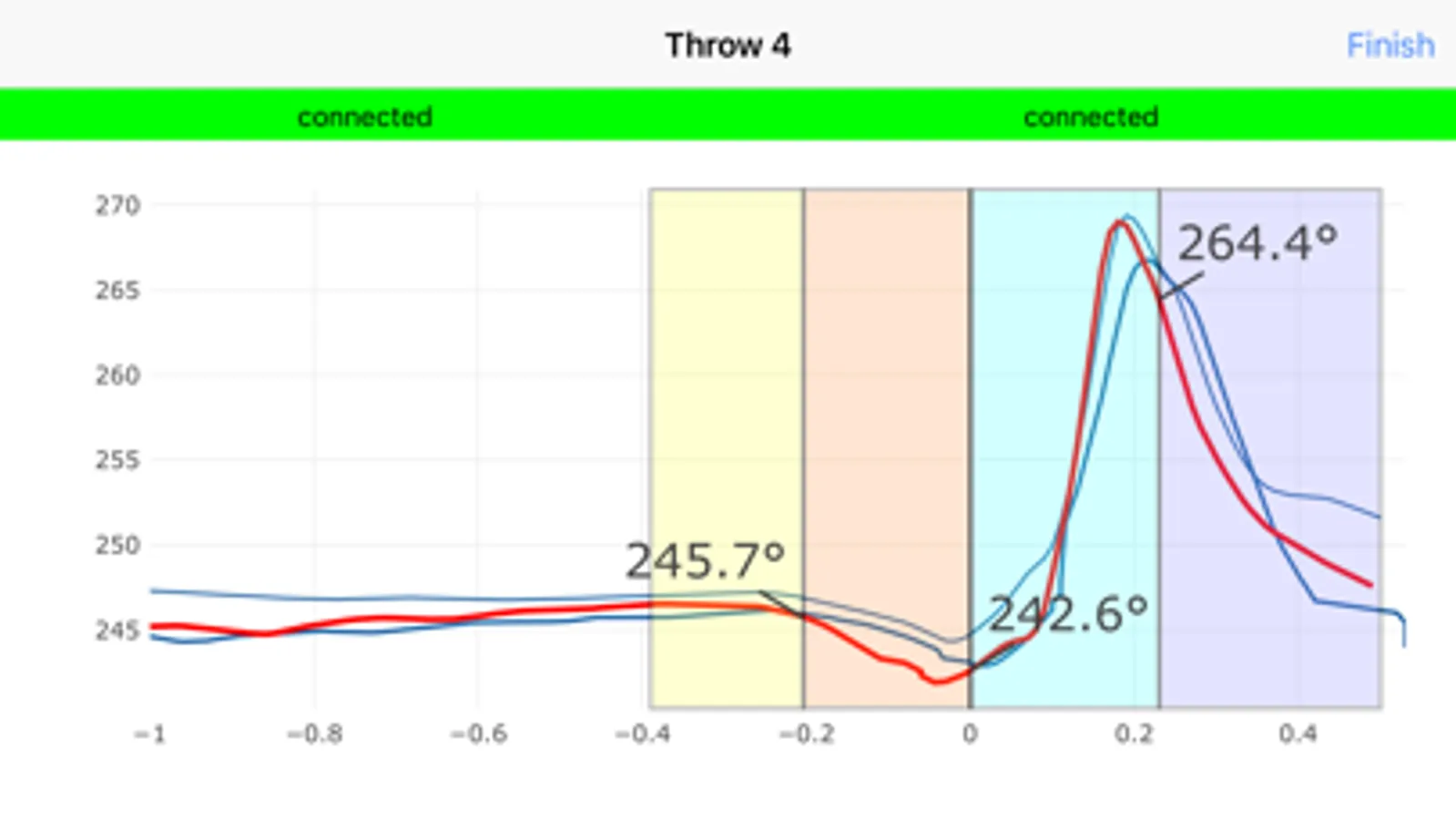 In the graphical view, the acceleration values and the angles can be displayed in an X-Y diagram. Several throws can be displayed on top of each other so that differences between the individual throws can be quickly recognised.