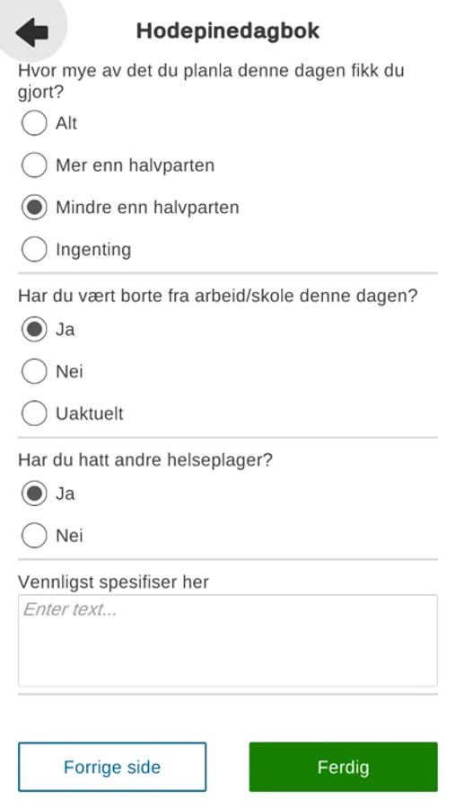 - Registreringsskjema for når du har hodepine, intensiteten av hodepinen, antall dager med hodepine, hodepinerelaterte symptomer og hvilke medikamenter du har brukt.