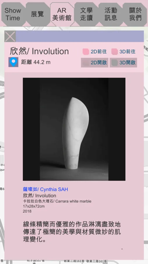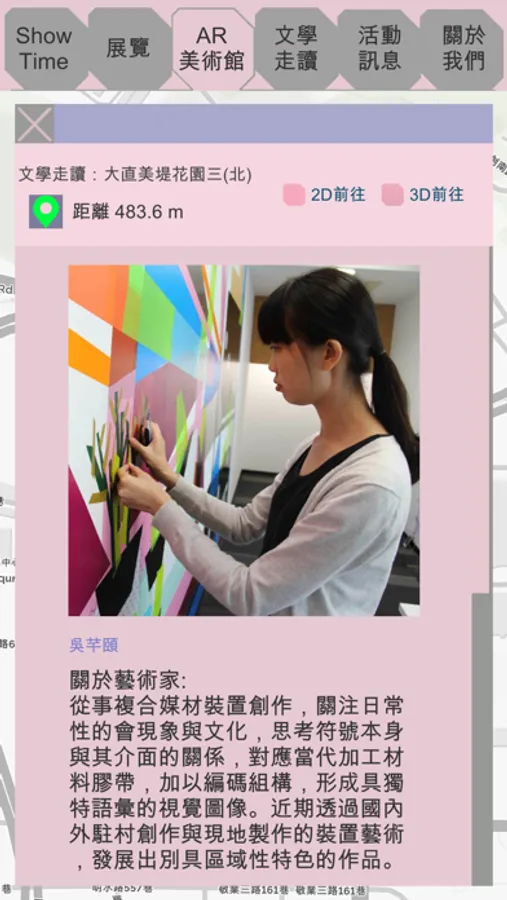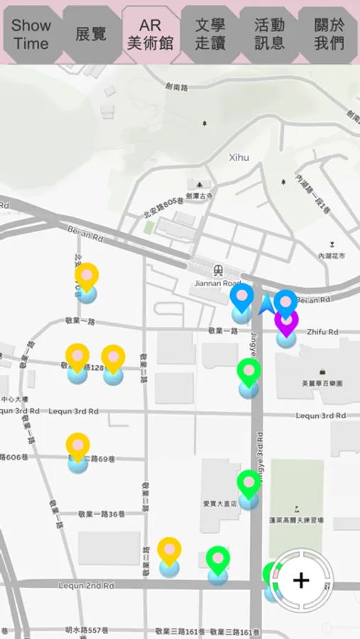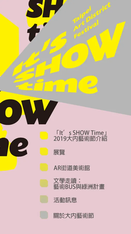 此應用程式為AR城市美術館計畫,於2019年大內藝術節的活動導覽程式,包含著展覽活動資訊、GPS地圖導航、AR戶外公共藝術、大直內湖AR歷史老照片等多個功能。