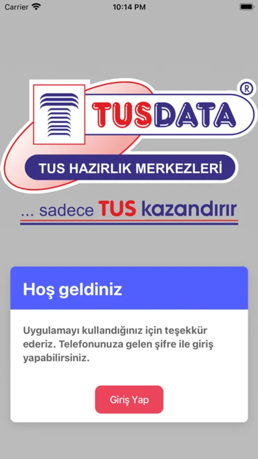 Bu uygulama sadece TUSDATA'nın kursiyerlerine özel olarak hazırlanmış olup, uygulamayı kullanabilmeniz için gerekli olan kod sms ile tarafınıza özel olarak oluşturulup gönderilmiştir. Eğer kayıt işlemlerinde kullanmanız gereken kod tarafınıza ulaşmadıysa kaydınızın bulunduğu TUSDATA şubemiz ile iletişime geçebilirsiniz. Uygulamayı kursiyerliğiniz devam ettiği sürece kullanabilirsiniz.
