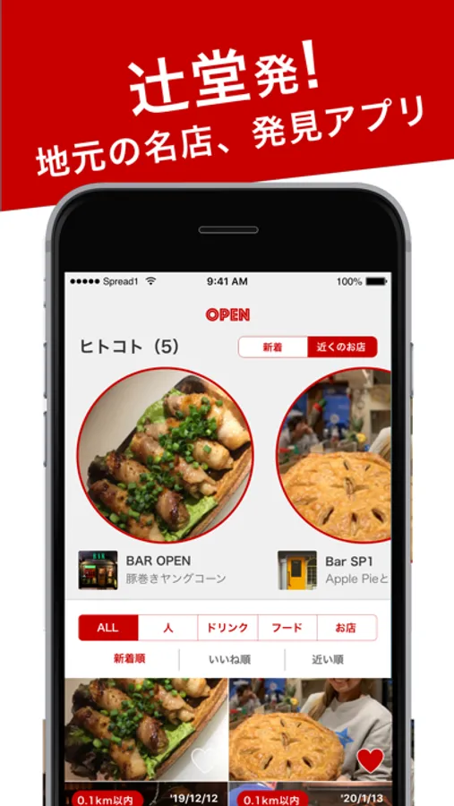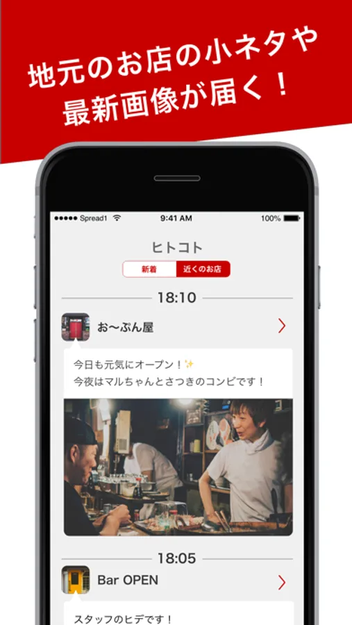 「ヒトコト」:OPENを利用するお店のスタッフが、時限設定付きで投稿されるコメントや画像などの情報です。