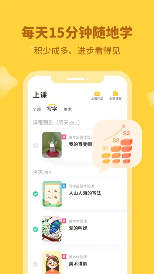 课程体系:现有人文、写字、美术等科目,可在河小象完成书法美育的启蒙和进阶学习