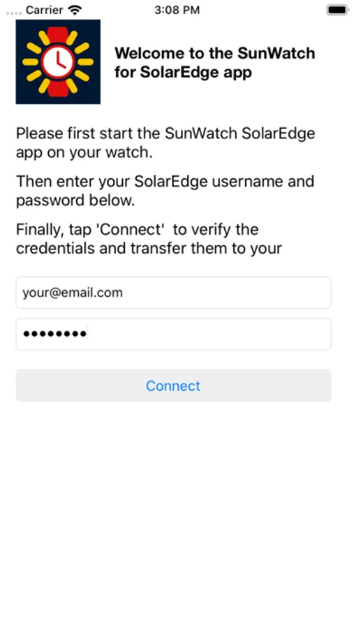 In order to view the data of your PV installation, please first start the app on your iPhone and login using the same account you use for logging in to the SolarEdge Monitoring Platform website.