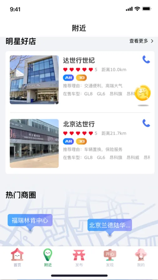 开心摩范是以4S店为中心,链接人•车•生活等周边服务智慧生态圈。通过LBS和AI大数据分析以及有趣的AR互动技术,构建本地同城商圈;对资讯整合,为消费者智选4S店、试驾、购车提供指导建议。同时围绕衣食住行游,为消费者提供更加便捷、优惠的日常生活服务;