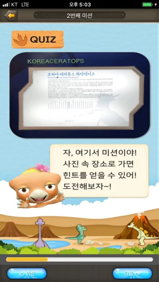 2단계. 미션을 수행한다! 개인 스마트폰을 활용해 공룡알화석산지를 자유롭게 관람하며 증강현실 게임, 퀴즈 등 다양한 미션을 수행합니다.