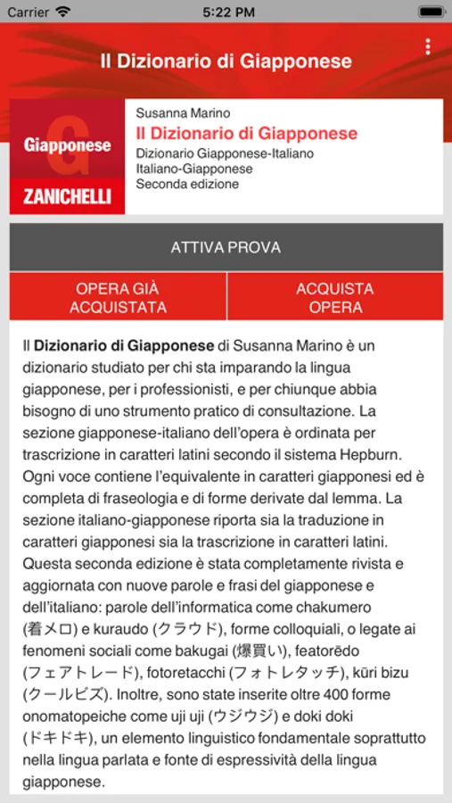 Il Dizionario di Giapponese di Susanna Marino è un dizionario studiato per chi sta imparando la lingua giapponese, per i professionisti, e per chiunque abbia bisogno di uno strumento pratico di consultazione. La sezione giapponese-italiano dell’opera è ordinata per trascrizione in caratteri latini secondo il sistema Hepburn. Ogni voce contiene l’equivalente in caratteri giapponesi ed è completa di fraseologia e di forme derivate dal lemma. La sezione italiano-giapponese riporta sia la traduzione in caratteri giapponesi sia la trascrizione in caratteri latini. Questa seconda edizione è stata completamente rivista e aggiornata con nuove parole e frasi del giapponese e dell’italiano: parole dell’informatica come chakumero (着メロ) e kuraudo (クラウド), forme colloquiali, o legate ai fenomeni sociali come bakugai (爆買い), featorēdo (フェアトレード), fotoretacchi (フォトレタッチ), kūri bizu (クールビズ). Inoltre, sono state inserite oltre 400 forme onomatopeiche come uji uji (ウジウジ) e doki doki (ドキドキ), un elemento linguistico fondamentale soprattutto nella lingua parlata e fonte di espressività della lingua giapponese.
