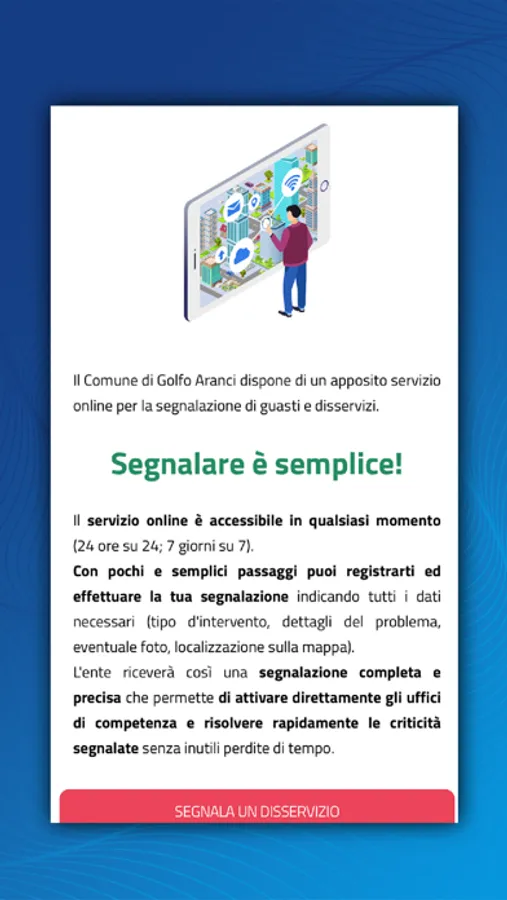 I cittadini saranno immediatamente informati, ad esempio, in caso di emergenze meteo, lavori stradali o chiusure straordinarie degli uffici pubblici e, a loro volta, potranno tempestivamente comunicare al Comune eventuali disservizi o disagi. Le segnalazioni vengono automaticamente indirizzate agli uffici competenti e il cittadino, sempre sul suo smartphone, potrà monitorare in tempo reale lo stato di avanzamento dei lavori.