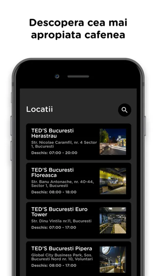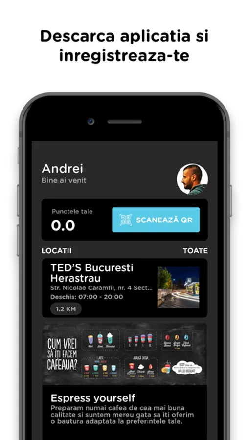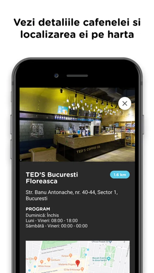 - Oferte si locatii. Esti mereu la curent cu noile oferte si beneficiezi de informatii legate de cea mai apropiata cafenea, distanta, adresa, harta si programul acesteia.