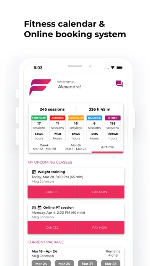 For your convenience, the app sends reminder notifications about your upcoming classes.