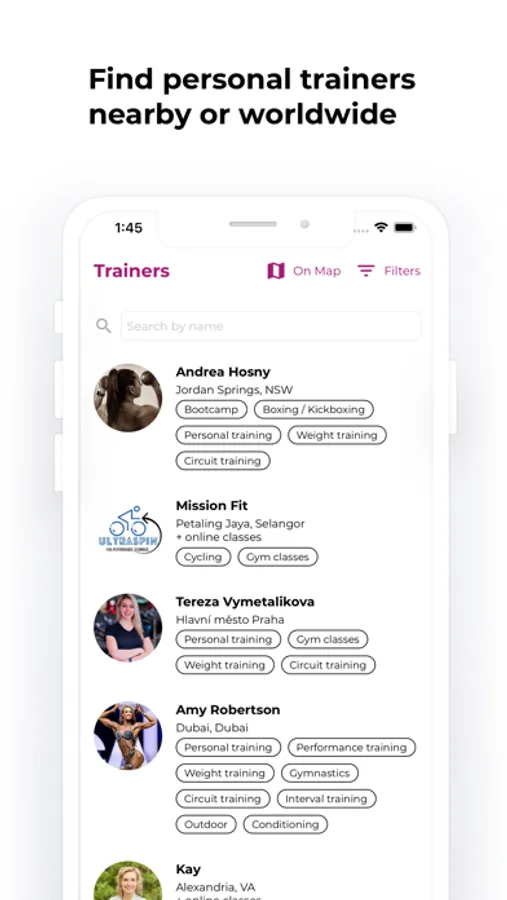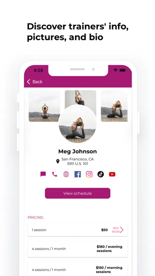 Choose fitness categories and discover personal trainers' profiles, their schedules, photos and bio, social contacts.