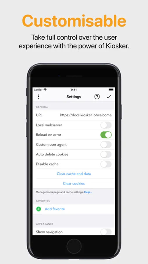 * Lock the device to Kiosker using guided access, single app mode (Pro version only), or autonomous single app mode (Pro version only).
