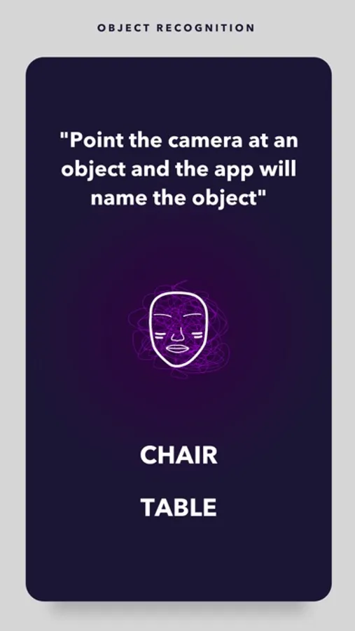 Object detection uses the iPhone camera to detect objects. Aim the camera in one direction and the app names the recognized objects via voice output.