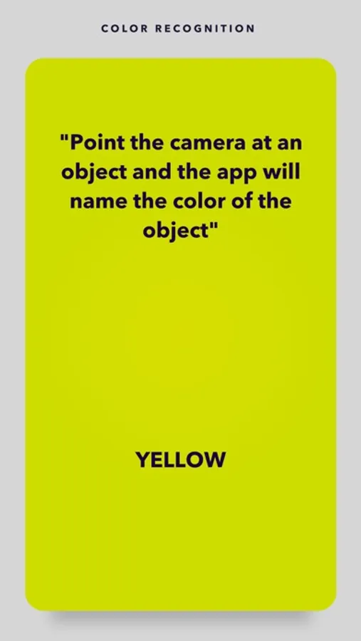 Color detection uses the camera to detect color. Aim the camera in one direction and the app will name the color via voice output.