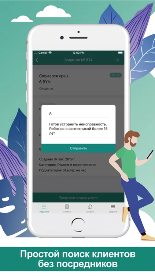 Заказ курьера, перевозка грузов, компьютерная помощь, уборка в квартире, ремонт автомобиля, муж на час и другие услуги в вашем распоряжении. Всего несколько кликов – и сотни потенциальных исполнителей спешат к вам на помощь.