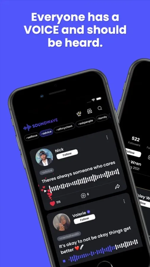 Everyone has a voice and needs somewhere safe to talk and sometimes it can be hard to talk about certain things with family or even friends. Soundwave is a safe community where you can talk about anything: mental health, depression, self-harm, trauma, eating disorders, a bad breakup or a relationship, school, or work...we want to normalize real talk again. If you want to talk about it, we are here to listen. No judgments. No bullying. No trolls. Just people who care.