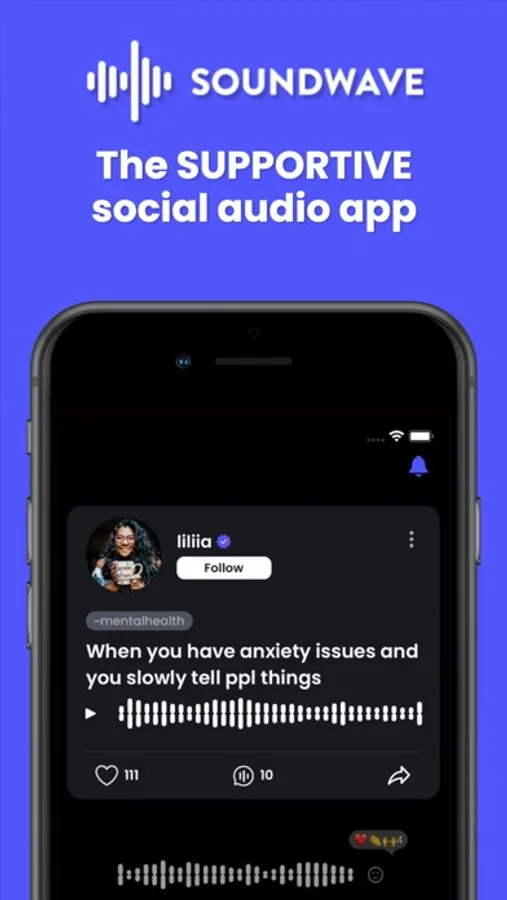 Soundwave fits within your busy life. At the click of a button, you can express your voice in an authentic and unfiltered way while joining real conversations and building community. When you have something to say just tap record, post it to the community, and even share it on other platforms. Download Soundwave and you can safely talk about any struggles and reach support across many areas including, anxiety, self-harm, living with depression, loneliness, PTSD, bipolar, suicidal thoughts, and many more.