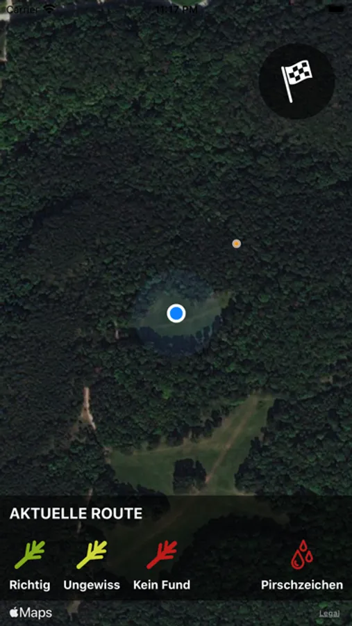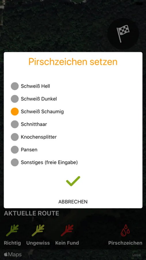 Farblich werden Wege, die zu Pirschzeichen geführt haben, grün markiert und das jeweilige Pirschzeichen (Schweiß, Schnitthaar,…) in der Karte, auf Ihren Wunsch, erfasst. Routen die ohne Pirschzeichenfund gegangen wurden, werden rot markiert. Dadurch gehen Sie keine Wege mehr doppelt und finden einfach zum letzten Pirschzeichen zurück.