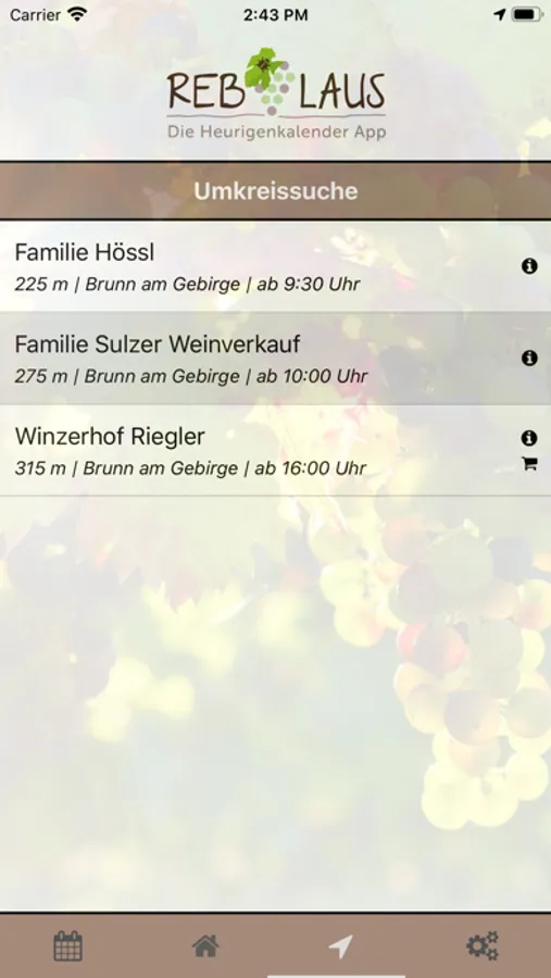 Mit der Umkreissuche finden Sie schnell und einfach den nächstgelegenen Heurigen anhand Ihres aktuellen Standorts.