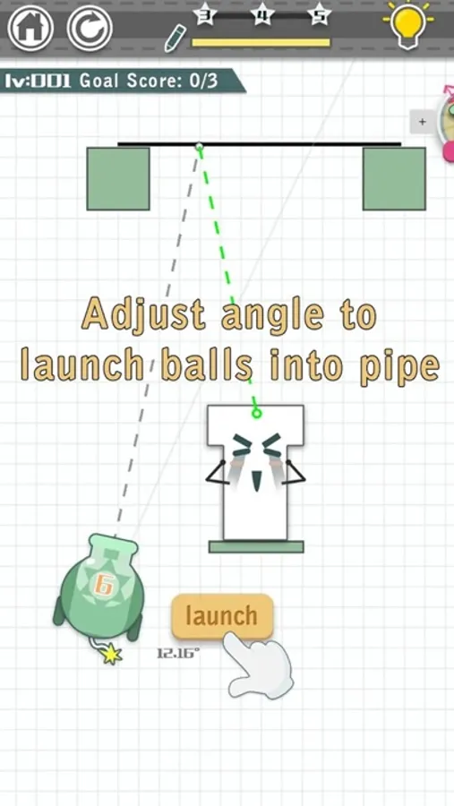 The pipe is sad because it's empty. Your job is to draw a line, find the best angles and positions to launch the ball into pipe after physical reflection.The key to clear stage is to make pipe filled up with balls and smile again!