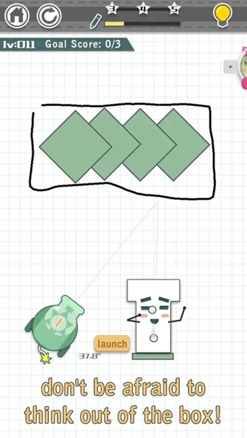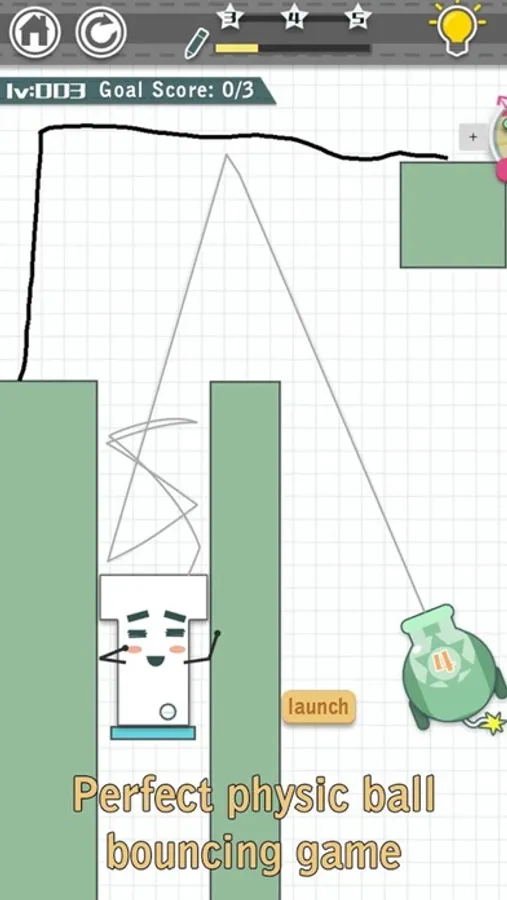 There isn't only one solution to complete level.You can come up with your own solution and when you draw lines, don't be afraid to think out of the box!When you launch the ball, aim carefully, different changes in different angles.