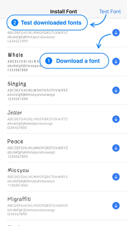 → Click the "Test Font" button in the upper right corner to view and click the "Change Font" button to use it.