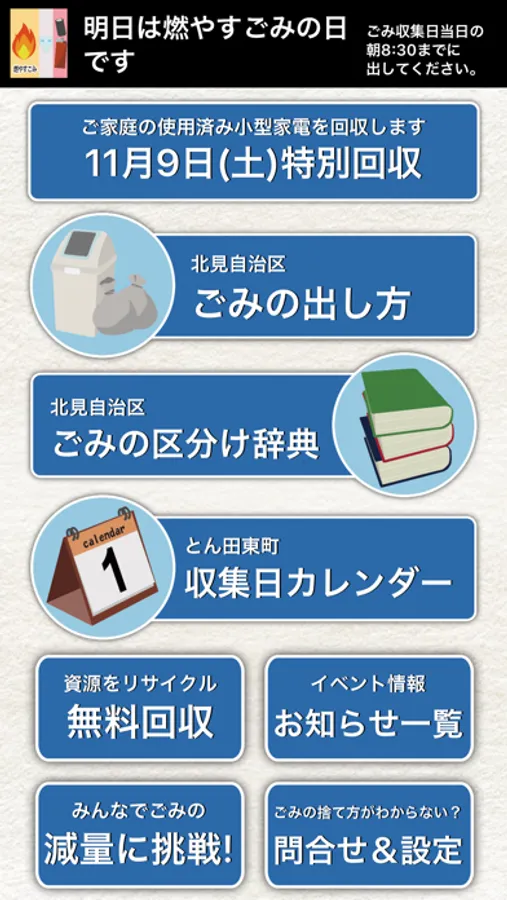 主な機能として、ごみ収集のスケジュールが分るカレンダー表示、ごみの出し忘れ防止に役立つ通知機能、分別や廃棄方法に関するQ&Aなどです。
