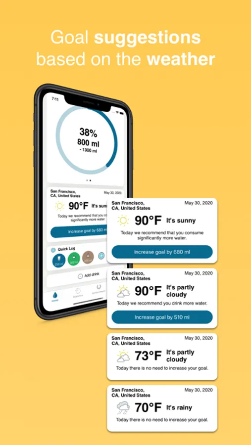 Based on your body weight, gender, age and activity level (or your personal goal) Drinkit will remind you to drink water to reach your daily goal.