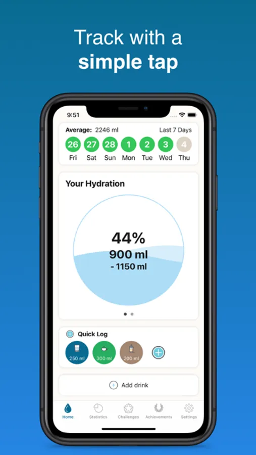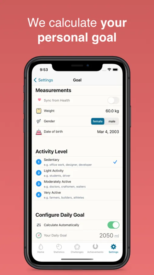 Every human is different — Thats why not everyone needs to drink the same amount per day. Depending on your body measurements, Drinkit will calculate the amount of water for your personal daily goal.