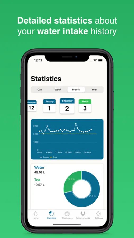 A beautiful line and pie chart visualise your water intake. How much water did you drink this month? What are your most logged drinks? Are you drinking less water this week than the last week? How often did you achieve your goal this year? You will find the answer in the statistic section in Drinkit.