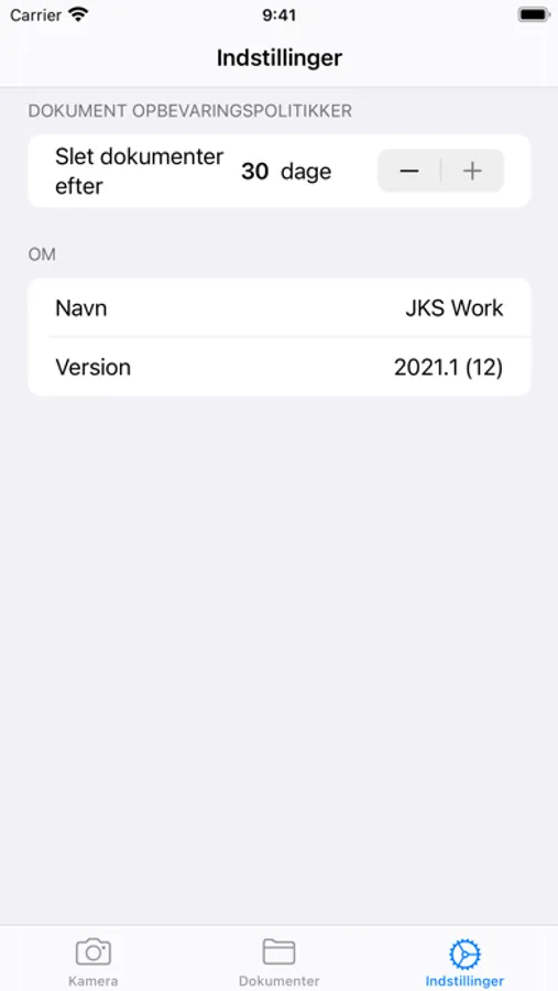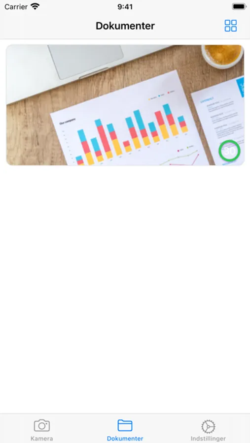 Under Kamera er det muligt lave at tage nye billeder direkte fra din enheds kamera, Dokumenter giver dig et overblik over alle dine billeder og mulighed for at behandle dem. Det er muligt at indstille perioden for opbevaring under Indstillinger.