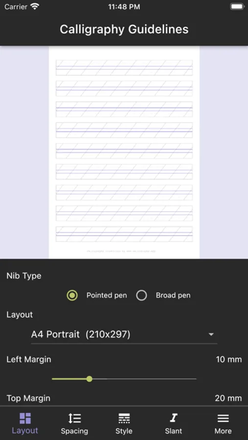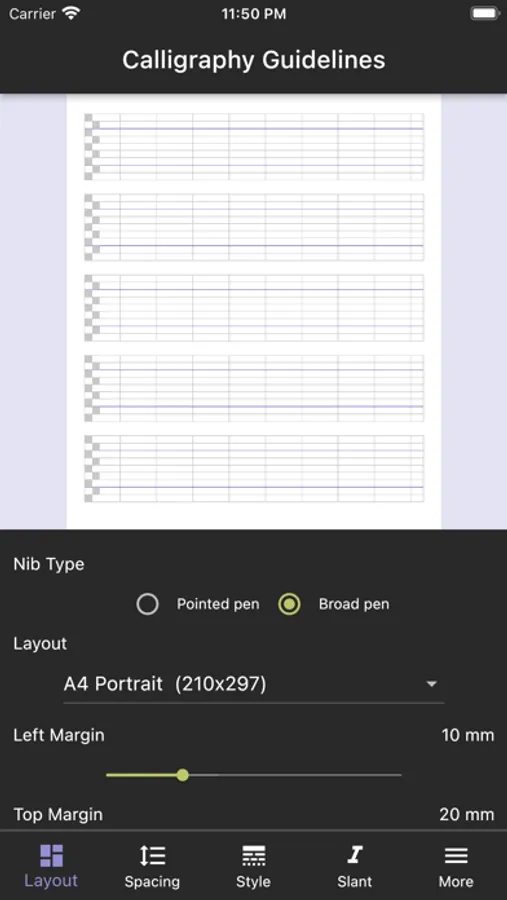 The free version without a subscription allows customizing all settings for both pointed pen and broad pen nibs and previewing the resulting guidesheet on the screen.