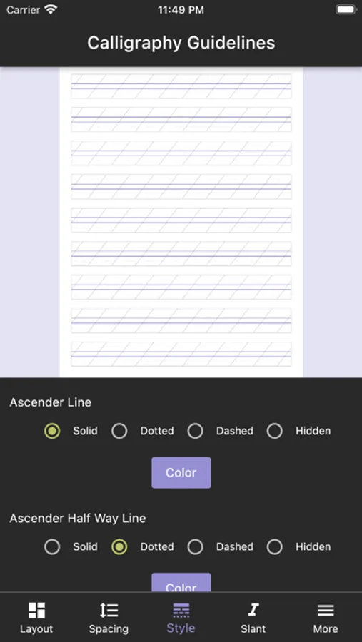 * Select your favorite style for ascenders, descenders, waistlines, and baselines from Solid, Dotted, and Dashed lines. Hide any of the lines using the Hidden style.