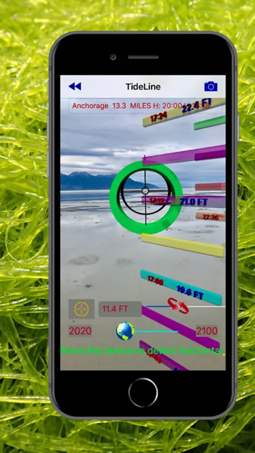 Like other tidal level Apps on the iPhone, TideView takes your current location and searches for the nearest tidal stations that support sea level reporting every 6 minutes. You choose a date, time and a station that best reflects the water level where you are currently standing. Find a location on the beach that is just at the sea water level and move the phone until it detects the horizontal plane of the beach. The next 12 hours of water levels will appear before you taking the beach as a baseline for the tide level at that location. An AR 3D arch of lines follows the water level above and below ground depending on where you are in the tide cycle. You can rotate the tide view or walk around it! A tide aiming crosshairs will descend when activated to the level of the iPhone camera lens allowing you to take aim at a location for analyzing heights at various tide levels. For example if you want to see if your kayak camping spot will be underwater at high tide!