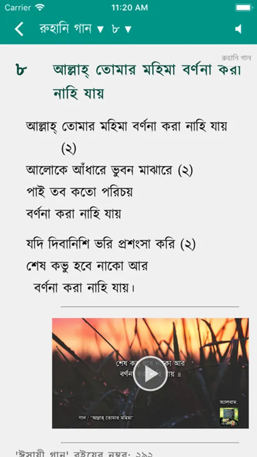 The Bengali worship songbook features over 300 songs, each accompanied with metadata on author and source. Many songs come with accompanying audio and/or video recordings available for optional download, along with guitar chords.