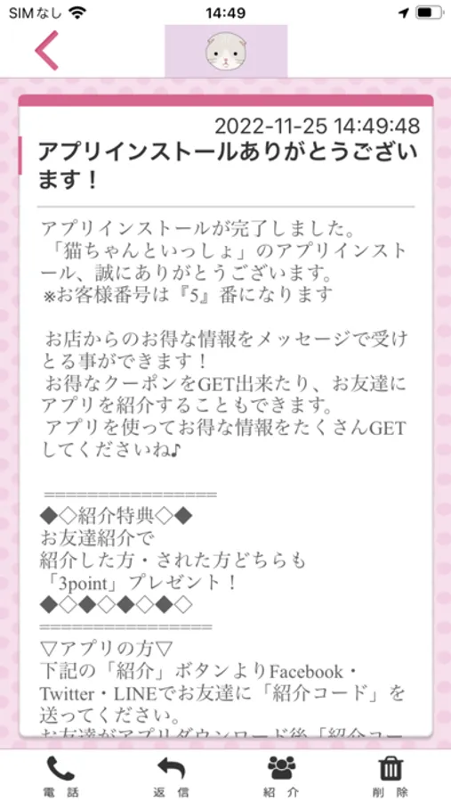 猫ちゃんカフェのアプリをSNSを通じてお友達に紹介する事ができます。