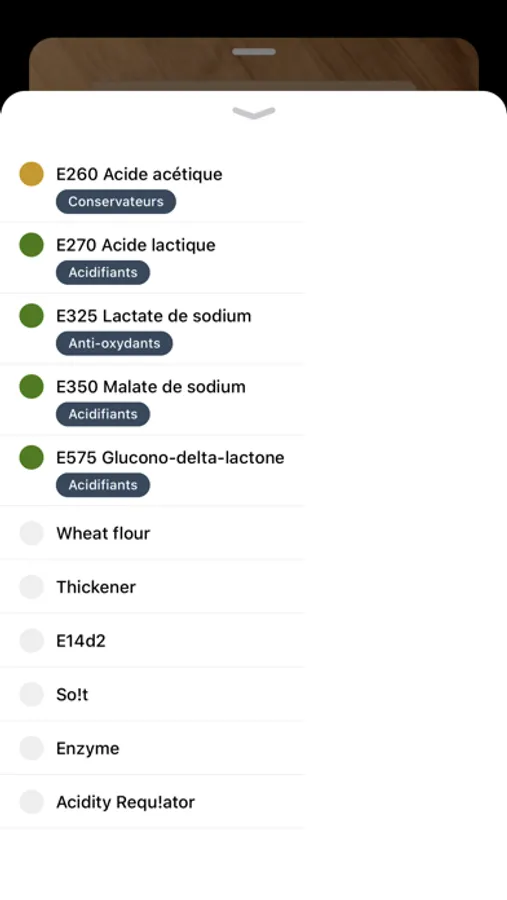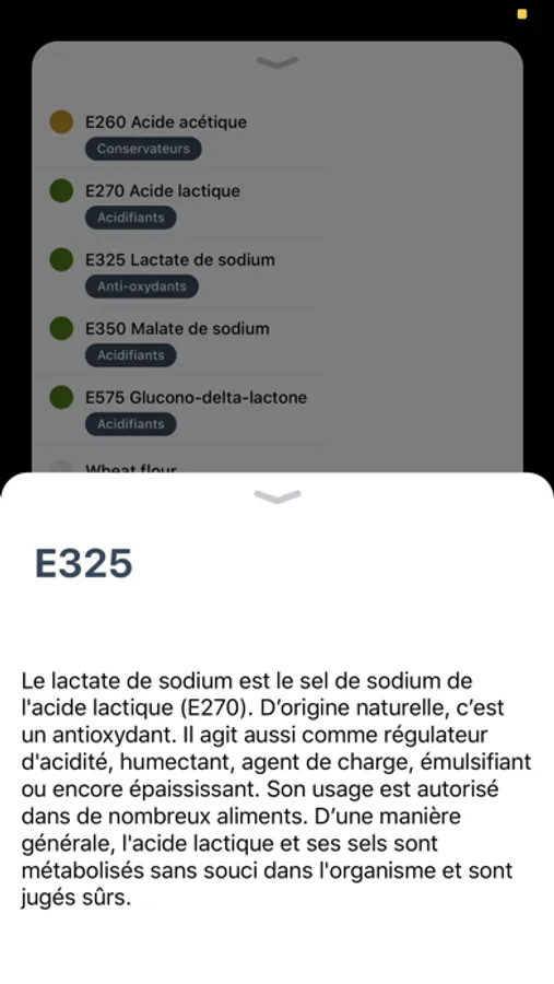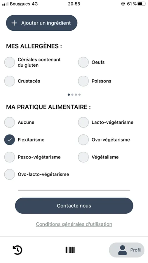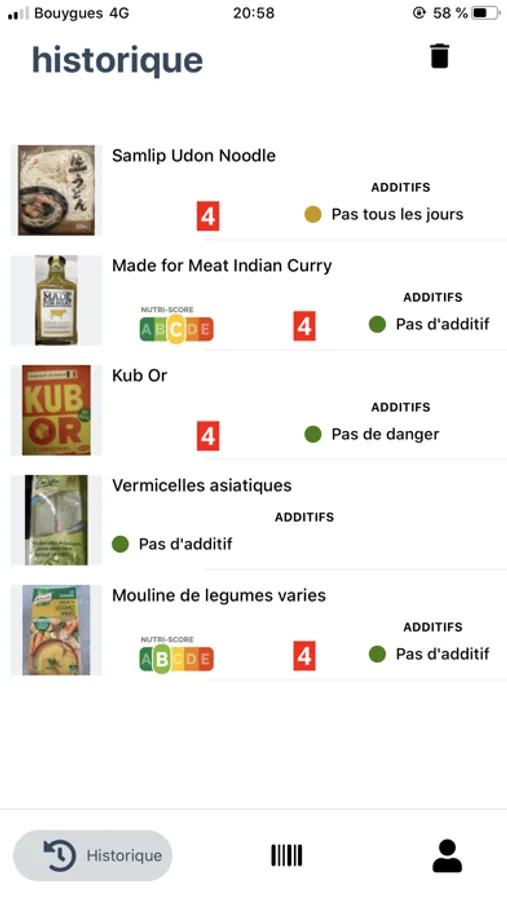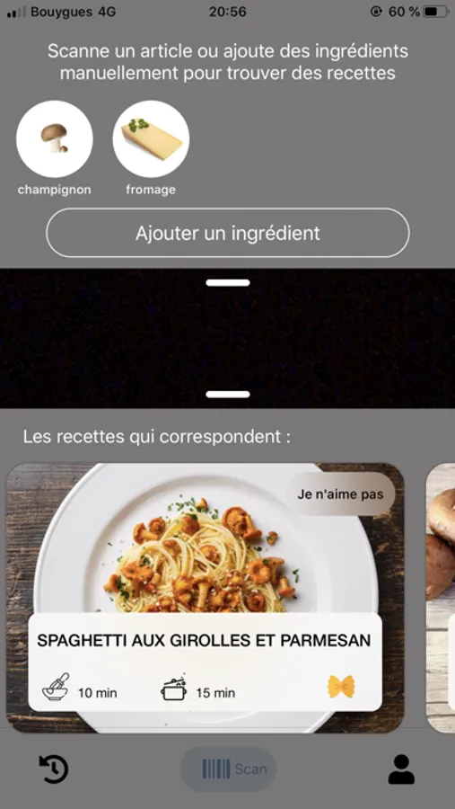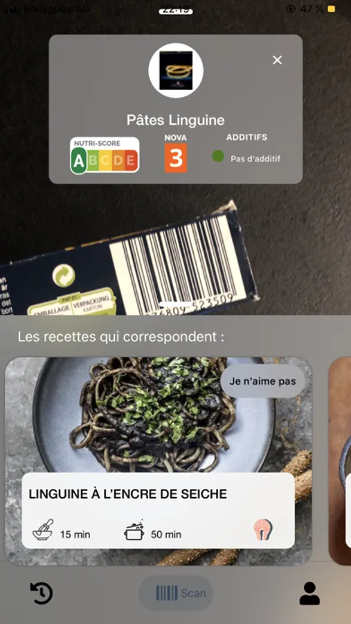 - A scan to allow you to scan your products to find corresponding recipes, always according to your desires. You also have access to the Nutri-score and Nova classifications and to the additives for each product.