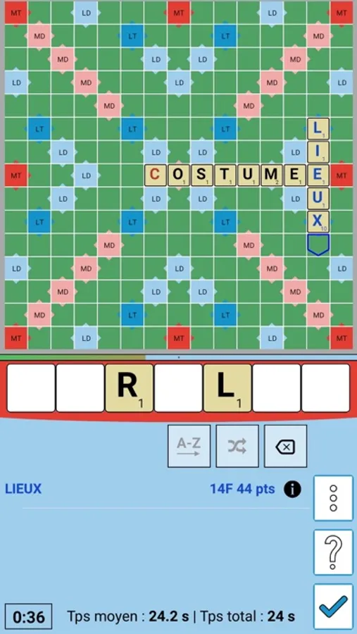 Choisissez votre mode de jeu (partie normale, Joker, 7 sur 8, 7 et 8, 7 sur 8 Joker, 7 et 8 Joker...), le temps par tour (Normal, Semi-rapide, Rapide, Blitz...), puis débutez la partie. Les lettres sont tirées automatiquement à chaque coup : proposez votre solution puis consultez si vous le voulez la liste des solutions les plus chères, ainsi que leur définition.