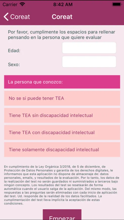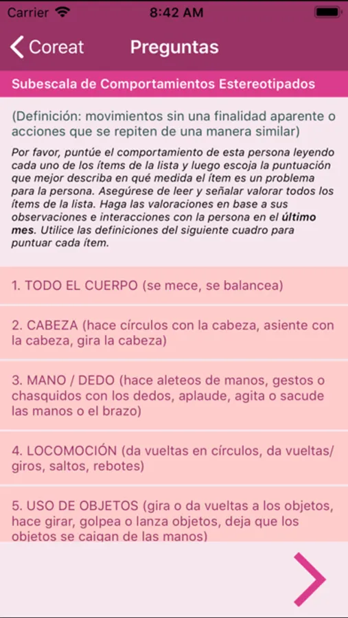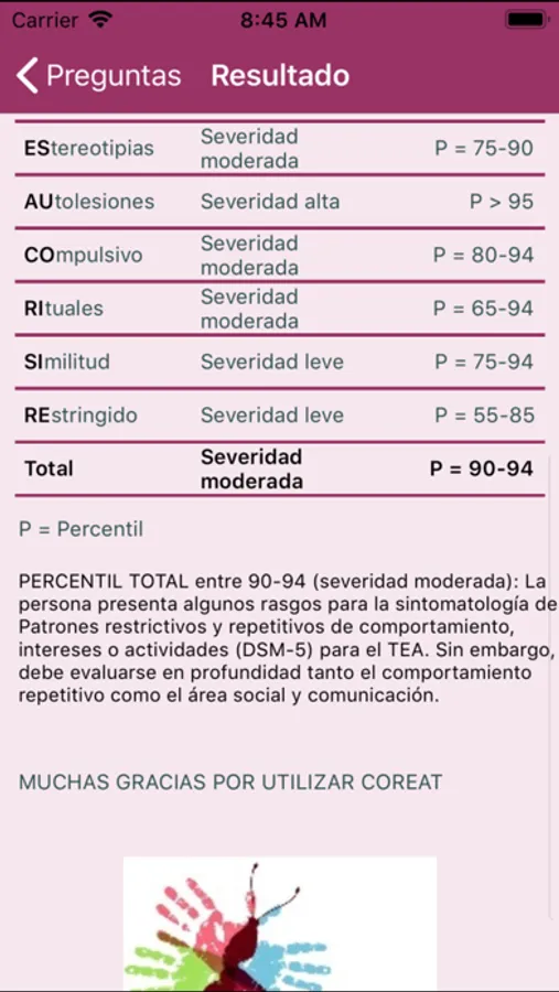 El app Conducta Repetitiva Autismo Test (COREAT) se trata de un test que mide el nivel de severidad de la conducta repetitiva tanto en personas con Trastorno del Espectro Autista (TEA) como en personas con Discapacidad Intelectual (DI). COREAT es la adaptación española del Repetitive Behavior Scale – Revised (RBS-R) un instrumento que ha mostrado excelentes propiedades psicométricas en estudios internacionales y en población española para el diagnóstico diferencial del TEA. Con esta aplicación podrá obtener el nivel de severidad de los síntomas: estereotipados, autolesivos, compulsivos, de similitud, ritualísticos y restrictivos. La información proporcionada tras realizar el test será de gran utilidad tanto para el profesional (obtención de percentiles para redacción de informes), como para los familiares que pueden visualizar la gravedad de los síntomas en unas gráficas sencillas.
