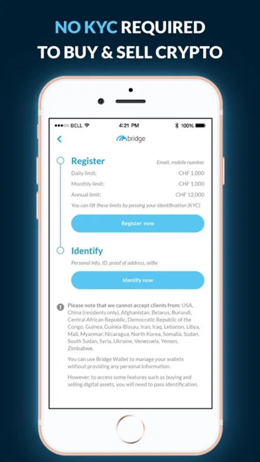 Buy and cash out crypto without having to identify up to $1,000 per day, $15,000 per month and $100,000 per year.