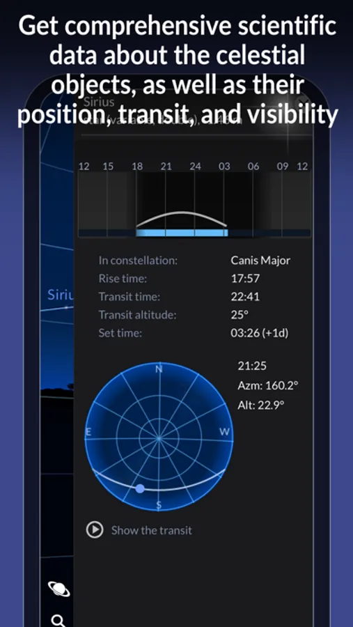 • Get comprehensive scientific data about the celestial objects, as well as their position, transit, and visibility