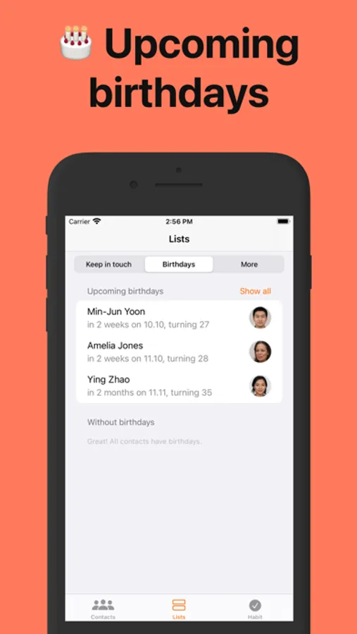 Reminders to keep in touch and remember birthdays. Close personal relationships make life happier, healthier and longer.