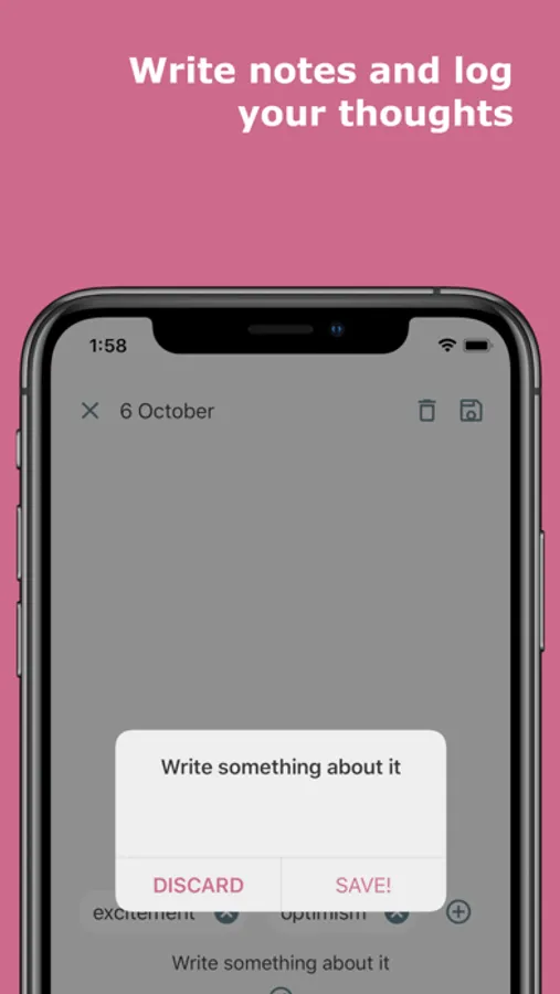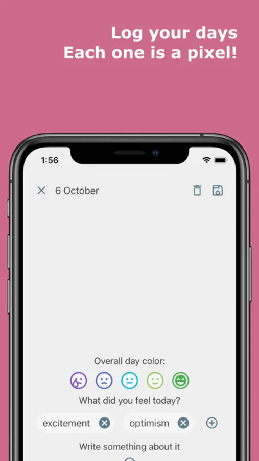 Track your mood in a simple, quick and easy manner. Every day is a Pixel! You can log your thoughts through notes and the emotions you felt.